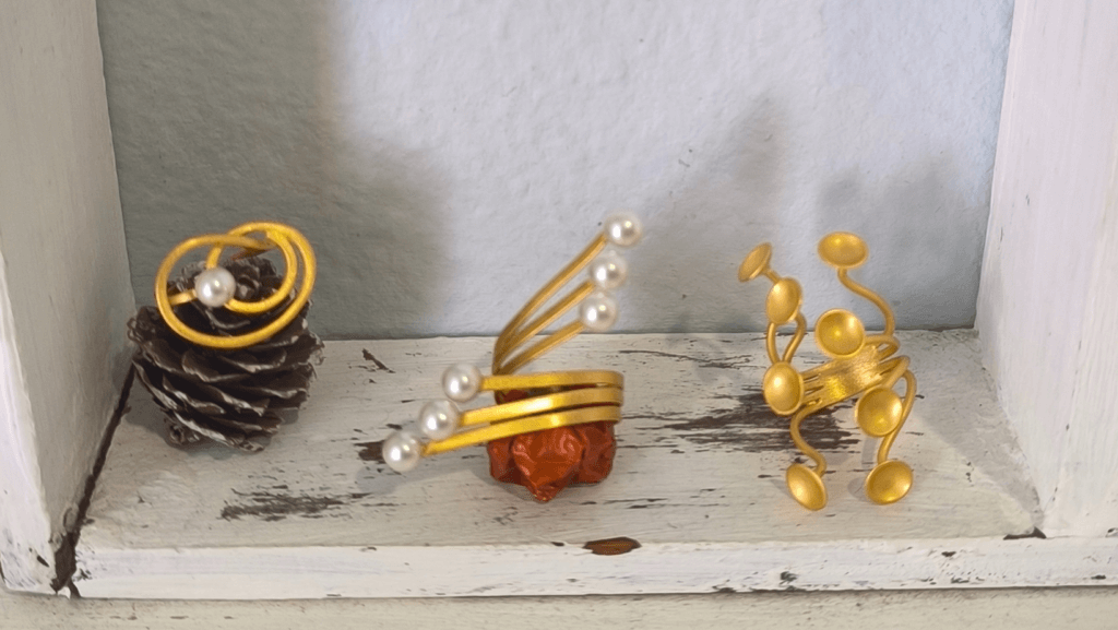 Έτσι και εκείνη στη δική της επιχείρηση, άλλοτε δημιουργεί κάτι απλό, ήσυχο, μίνιμαλ και άλλοτε κάτι δυνατό και έντονο. Η δημιουργικότητά της είναι ανήσυχη. Ψάχνει νέες τεχνικές, νέα υλικά, νέες μορφές έκφρασης. Από ασήμι, μπρούτζο και επιχρύσωση 22Κ μέχρι φυσικά υλικά, θαλασσόξυλα, κοχύλια, κουκούλια μεταξιού και πηλό.